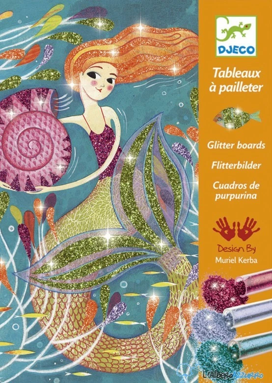 Met dit DJECO knutselpakket maak jij de mooiste zeemeerminnen. De set bevat 6 verschillende kleuren glitters daarmee maak je de 4 verschillende afbeeldingen uit deze glitter zand set. De kartonnen zijn voorgedrukt en hebben een stickerlaag die je per nummer kan verwijderen.