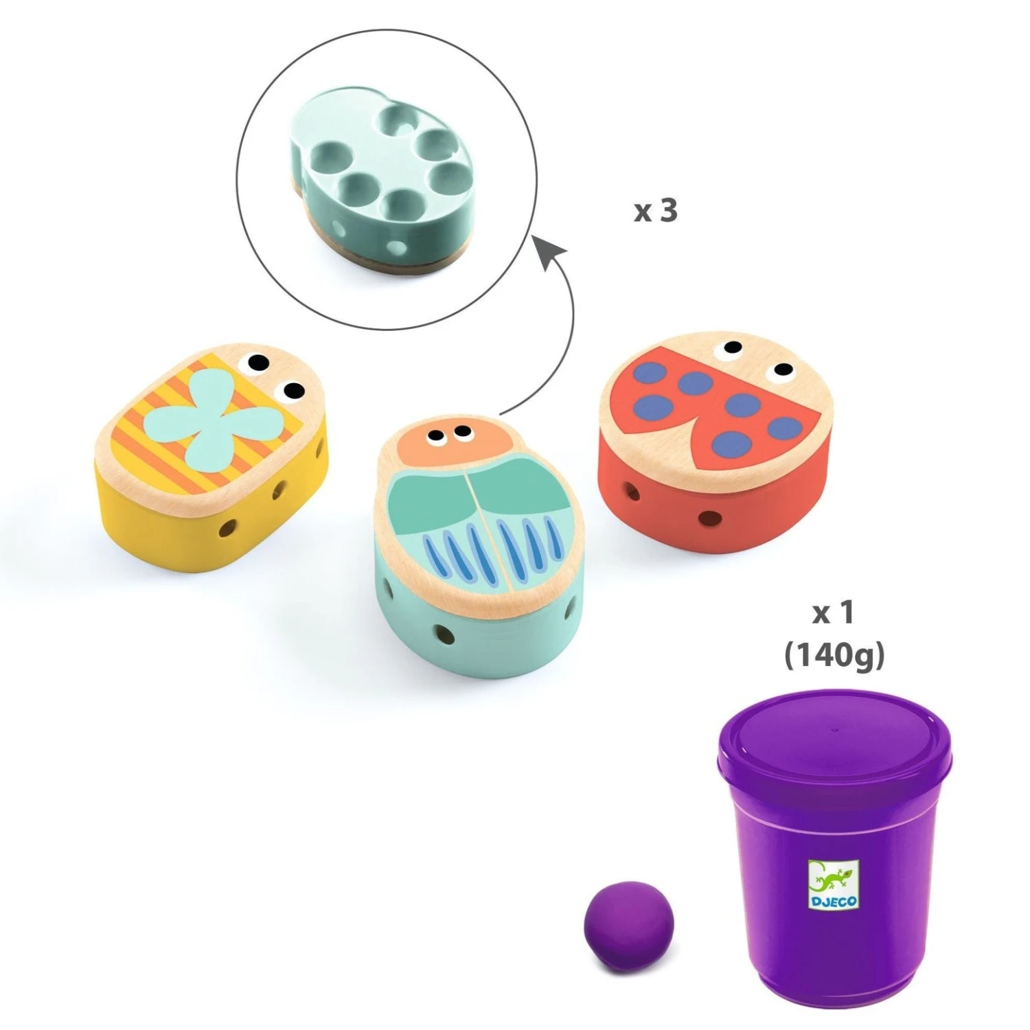 Met de DJECO klei set maken kinderen vanaf 18 maanden hun eerste werkjes met klei, en geven ze de insecten grappige pootjes.
