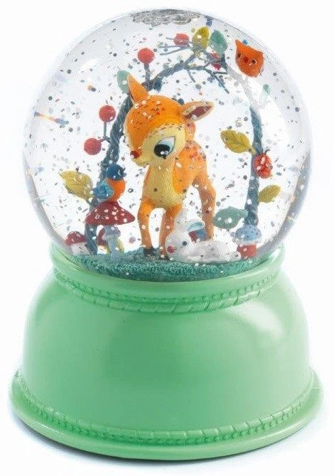 Een nachtlampje van DJECO en een prachtige sneeuwbol met een hertje erin. Schudden is niet nodig, zet het lampje aan en de glitters dwarrelen van zelf door de bol. Het lampje produceert zelf verschillende kleuren.