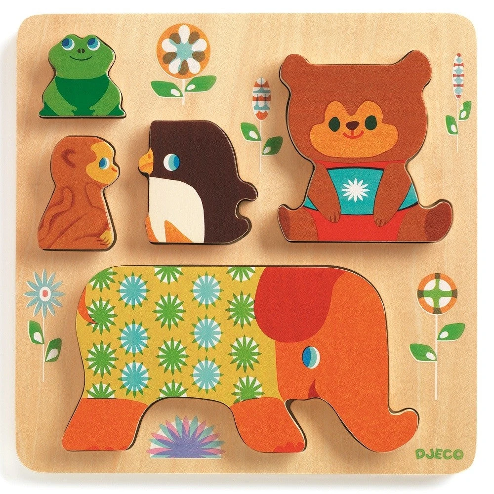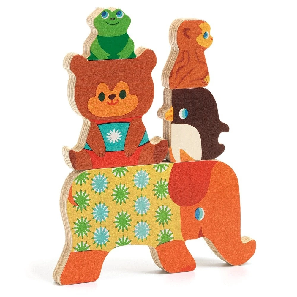 Een vormenpuzzel Woodypile van het Franse merk DJECO. Een houten puzzel met 5 vrolijke dieren (puzzelstukken). Een olifant, een beer, een pinguin, een aap en een kikker. En het allerleukste is dat je er ook nog een leuke stapeltoren van kunt maken.