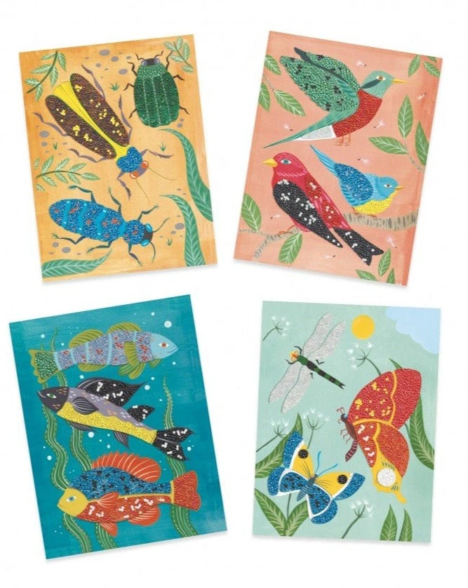 Met dit DJECO knutselpakket maak de mooiste schilderijen met een prachtig resultaat: glanzende vogels en insecten. Kies uit 1 van de 4 dierenkaarten en breng lijm aan op een vak in de kaart. Leg de kaart in de doos en strooi de kralen op de plakbare plekken. Gebruik 1 kleur of maak een patroon, de meegeleverd stukjes zorgen dat je heel precies kunt werken.