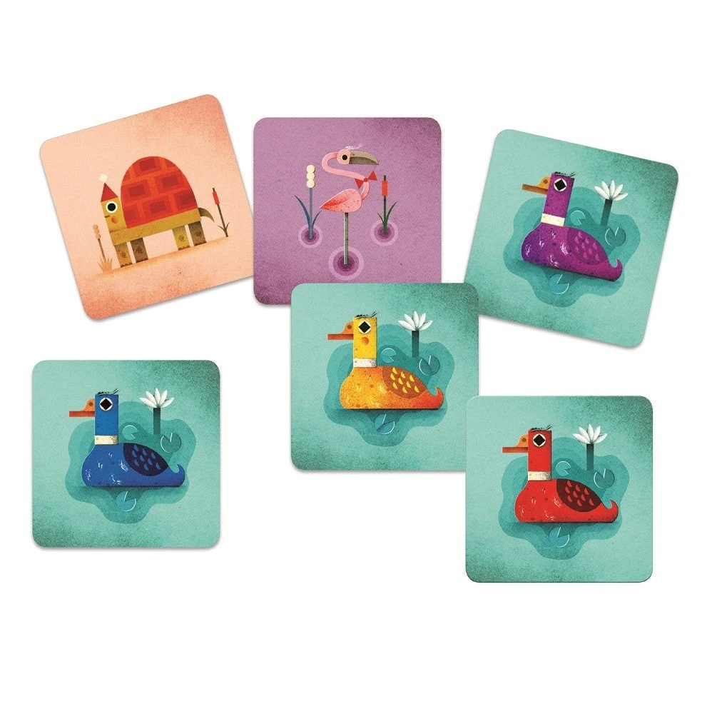 Een spannend kaartspel van het Franse speelgoedmerk DJECO. Welke eend met 3 poten heeft de tegenstander?